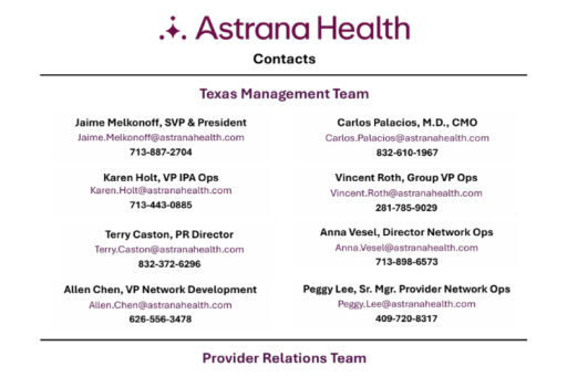Astrana Health Texas Management Team & Provider Relations Team Contacts.